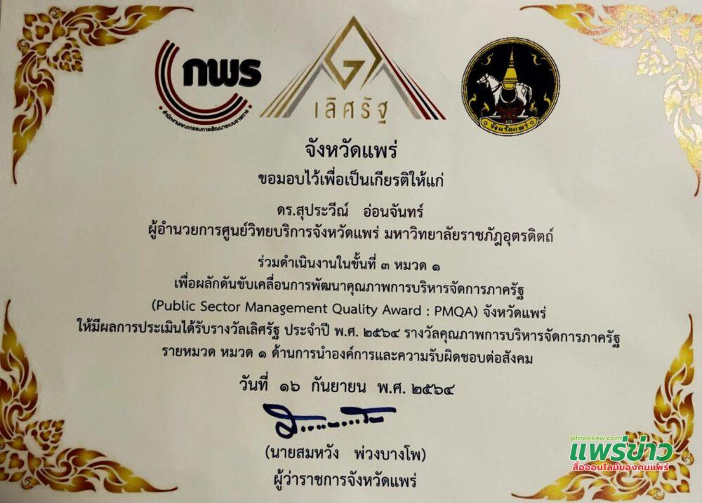 ดร.สุประวีณ์ (ดร.ติ๊ก) อ่อนจันทร์ กล่าวว่ารางวัลเป็นความภาคภูมิใจยิ่งที่ได้รับเกียรติบัตรในครั้งนี้ ที่บุคลากร มรอ.ที่ได้ร่วมดำเนินงานในขั้นที่ 3 หมวด 1 ที่สนับสนุน จัดทำข้อมูลสารสนเทศจังหวัดแพร่ เพื่อนำเสนอขอรับการประเมิน ที่นำหลักการขับเคลื่อนการพัฒนาคุณภาพการบริหารจัดการภาครัฐ (Public Sector Management Quality Award : PMQA) ในพิธีมอบรางวัลเลิศรัฐ ประจำปี 2564 รางวัลคุณภาพการบริหารจัดการภาครัฐ (PMQA) รายหมวด หมวด 1 ขอขอบคุณทุกภาคส่วนที่ร่วมมือกันทำงานจนให้จังหวัดแพร่ได้รับรางวัลในครั้งนี้