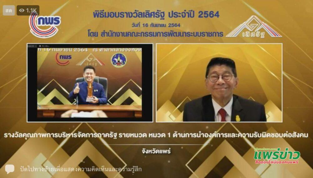 โดยได้รับรางวัลเลิศรัฐ สาขาการบริหารจัดการภาครัฐ หมวด 1 การนำองค์การและความรับผิดชอบต่อสังคม ประจำปี 2564 จากสำนักงาน กพร. โดยมียอดหน่วยงานที่สมัครขอรับรางวัลสูงสุดในรอบ 15 ปี รวม 1,608 ชิ้นงาน ทั้งนี้ มีจังหวัดที่ได้รับรางวัล สาขานี้จำนวน 3 จังหวัดได้แก่ จ.แพร่ จ.ขอนแก่น และ จ.พิษณุโลก