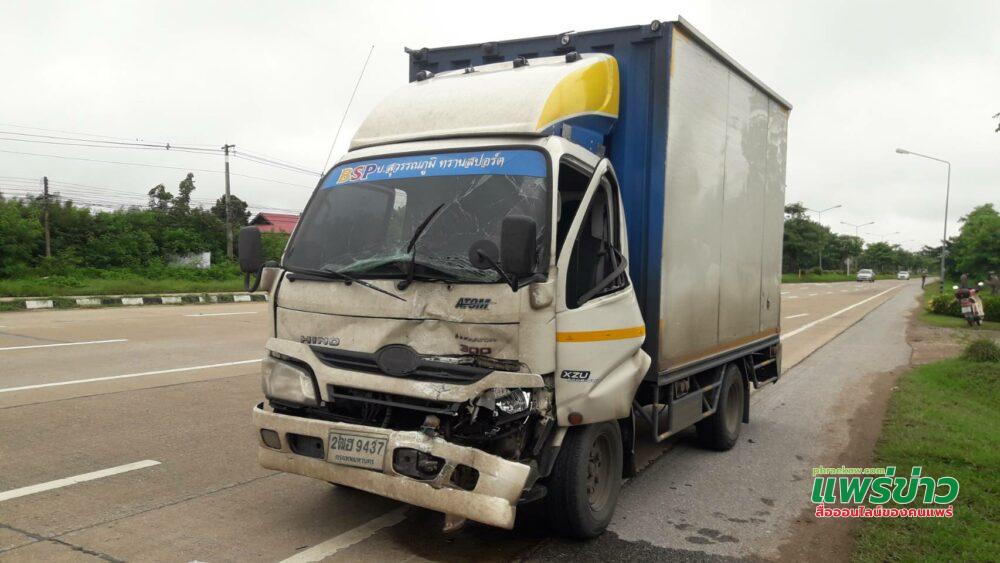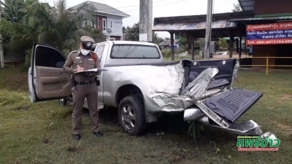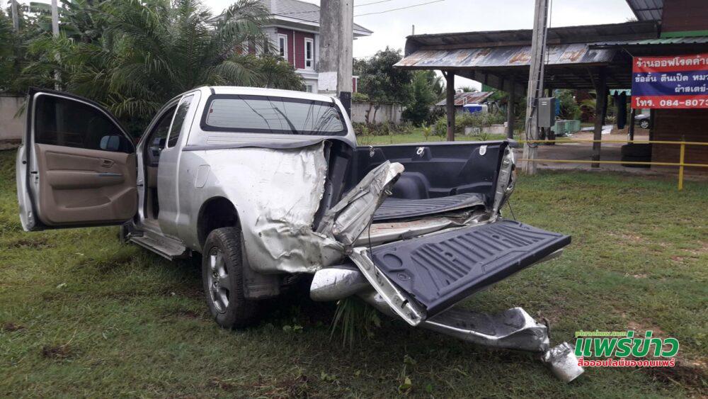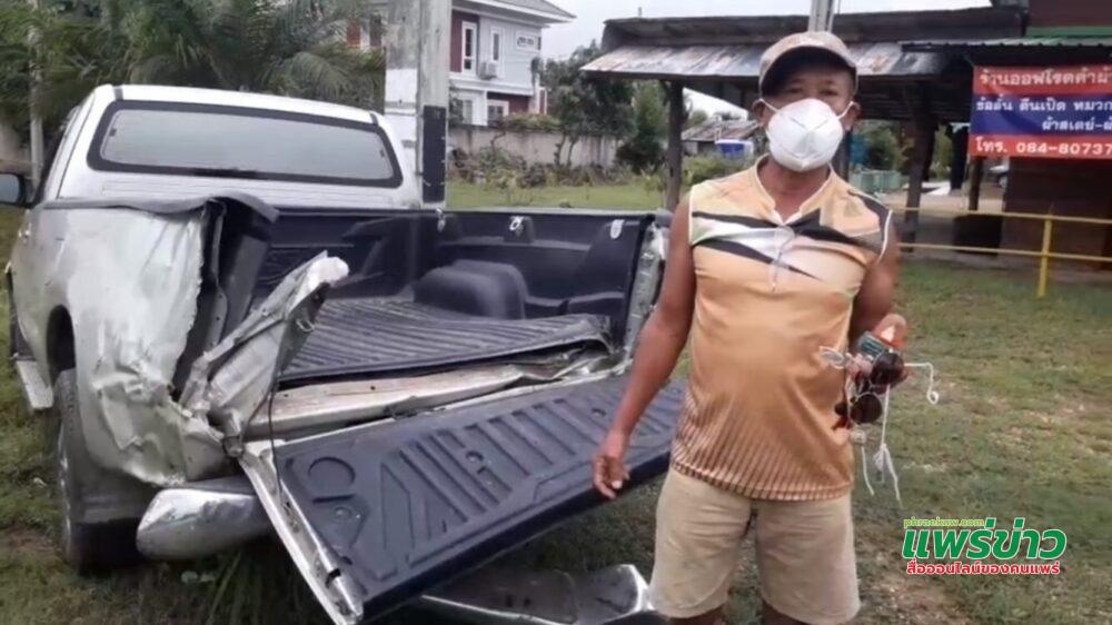 ที่เกิดเหตุพบรถยนต์กระบะโตโยต้า แค็ปสีบอนซ์ ทะเบียน บบ 2564 แพร่ สภาพเสียหลักพุ่งเข้าข้างทาง ข้างรถด้านคนขับอัดติดกับเสาไฟฟ้าแรงสูง สภาพท้ายรถพังยับเยินจากการถูกชน โดยมี นายชัด สมนึก อายุ 67 ปี 455 ม.8 ต.แม่จั๊วะ อ.เด่นชัย จ.แพร่ เป็นคนขับรถ เผยว่า กำลังจะไปส่งลูกสาว ป. 6 อายุ 12 ขวบ ไป ร.ร.อนุบาลอนุพงค์พัชรินทร์ เหตุเกิดขณะลูกสาวกำลังนั่งทานอาหารเช้าอยู่เบาะหน้าคู่คนขับ โชคดีที่ไม่มีผู้บาดเจ็บ เพราะคาดเข็มขัดนริภัย จึงปลอดภัยทั้งสองคน