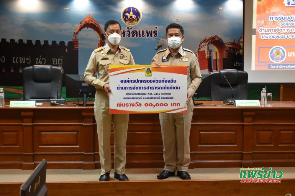 วันอังคารที่ 28 กันยายน 2564 เวลา 09.00 น. นายโชคชัย พนมขวัญ นายกเทศมนตรีเมืองแพร่ มอบหมายให้ นายพัฒนพงษ์ พงษ์นวล รองนายกเทศมนตรีเมืองแพร่ เข้ารับประกาศเกียรติคุณโครงการประกวดองค์กรปกครองส่วนท้องถิ่นด้านการจัดการสาธารณภัยดีเด่น ประจำปี 2564 ระดับเขต ประเภทเทศบาลเมือง พร้อมเงินรางวัลจำนวน 10,00 บาท จากกรมป้องกันและบรรเทาสาธารณภัย โดยได้รับการคัดเลือกจากศูนย์ป้องกันและบรรเทาสาธารณภัยเขต 15 เชียงราย ให้เข้าประกวดระดับภาค ประเภทเทศบาลเมืองต่อไป โดยมีนายสมหวัง พ่วงบางโพ ผู้ว่าราชการจังหวัดแพร่ เป็นประธานมอบในการประชุมกรมการจังหวัด ณ ห้องจดหมายเหตุศาลากลางจังหวัดแพร่