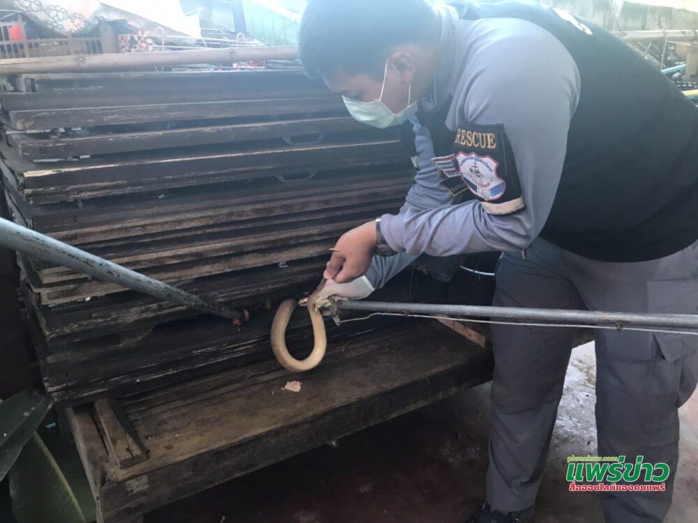 พบว่าที่บ้านเลขที่ 120/3 ม.3 บ้านร่องฟอง ต.ร่องฟอง อ.เมืองแพร่ พบ นางสายสุนีย์ ทองแสน อายุ 57 ปี เจ้าของบ้านยืนถือไม้รออยู่ที่จอดรถข้างบ้าน กับสุนัขสีน้ำตาลชื่อเจ้าบุญหลง ที่เห่ากองไม้อย่างเอาเป็นเอาตาย พร้อมชี้จุดที่เห็นงู เข้าไปในกองไม้ที่เป็นขอบหน้าต่างเก่าก่อเรียงกัน พร้อมยันยันว่าเป็นงูเห่า เพราะเห็นตอนมันแผ่แม่เบี้ยสู้กับสุนัข ก่อนจะหลบเข้าไปในกองไม้ ต่อมา สามารถจับตัวได้พบเป็นงูเห่า ตัวสีเหลืองอ่อนเกือบสีขาว ยาว 1 เมตร เป็นงูเห่าปลวก มีพิษร้ายแรง เจ้าหน้าที่ที่ได้รับการฝึกฝนมาแล้ว จึงจับใส่กรงไปปล่อยตามธรรมชาติ ต่อไป
