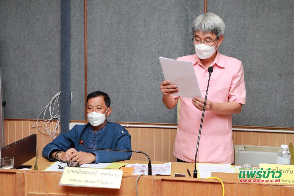 โดยมีนายโชคชัย พนมขวัญ นายกเทศมนตรีเมืองแพร่ พร้อมด้วยคณะผู้บริหาร เสนอเรื่องเพื่อพิจารณาตามระเบียบวาระการประชุม ประกอบด้วย เรื่องการขออนุมัติแก้ไขเปลี่ยนแปลงรายการงบประมาณรายจ่ายประจำปีงบประมาณ พ.ศ. 2563 ในหมวดครุภัณฑ์ การขออนุมัติขยายเวลาเบิกจ่ายงบประมาณรายจ่ายประจำปีงบประมาณ พ.ศ. 2563 และเรื่องการขออนุมัติกันเงินงบประมาณรายจ่ายประจำปีงบประมาณ พ.ศ. 2564 เงินบำรุงศูนย์บริการสาธารณสุขเทศบาลเมืองแพร่หมวดค่าที่ดินและสิ่งก่อสร้าง กรณียังมิได้ก่อหนี้ผูกพัน