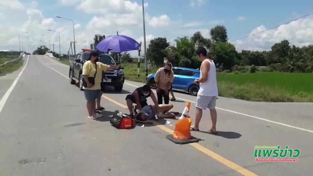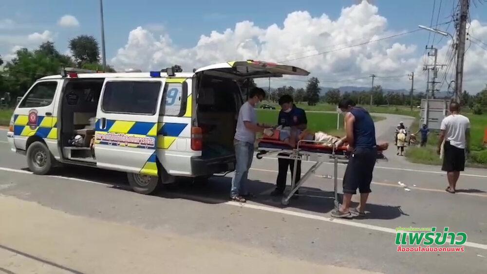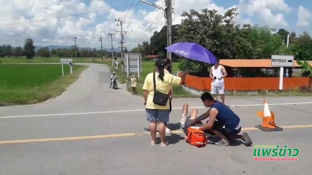 รถเก๋งเฉี่ยวชนรถจักรยานยนต์กลางสี่แยกถนนสายคลองชลประทานบ้านหนองช้างน้ำ ต.บ้านกาศ อ.สูงเม่น คนขับรถจักรยานยนต์ได้รับบาดเจ็บ