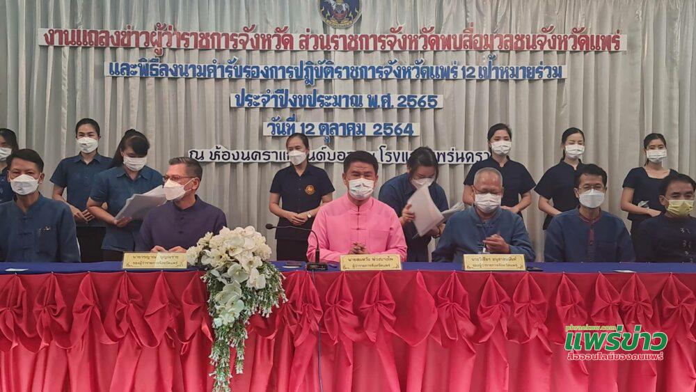จากนั้นได้มีการลงนามคำรับรองการปฏิบัติราชการจังหวัดแพร่ 12 เป้าหมายร่วม ประจำปีงบประมาณ 2565 ซึ่งจะเป็นการเริ่มต้นของการยึดโยงการทำงานร่วมกันระหว่างจังหวัดกับหน่วยงาน เพื่อร่วมกันขับเคลื่อนการทำงานของจังหวัดให้เป็นไปตามตัวชี้วัดและเป้าหมายการดำเนินงาน ประจำปีงบประมาณ 2565 อย่างมีประสิทธิภาพและเกิดผลสัมฤทธิ์ในการปฏิบัติภารกิจ เพื่อประโยชน์ของประชาชนและประเทศชาติ โดยผู้ว่าราชการจังหวัดแพร่ ร่วมลงนามกับหัวหน้าส่วนราชการบริหารราชการส่วนภูมิภาค 36 หน่วยงาน และนายอำเภอ 8 อำเภอ
