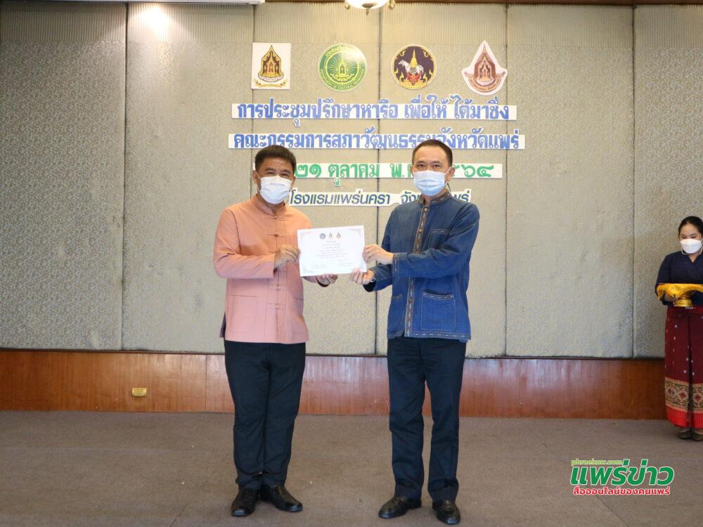 วันที่ 21 ตุลาคม 2564 เวลา 13.00 น. นายสมหวัง พ่วงบางโพ ผู้ว่าราชการจังหวัดแพร่ เป็นประธานในพิธีเปิด และมอบเกียรติบัตรให้กับคณะกรรมการสภาวัฒนธรรมจังหวัดชุดเดิม ในการประชุมปรึกษาหารือเพื่อให้ได้มาซึ่งคณะกรรมการสภาวัฒนธรรมจังหวัดแพร่