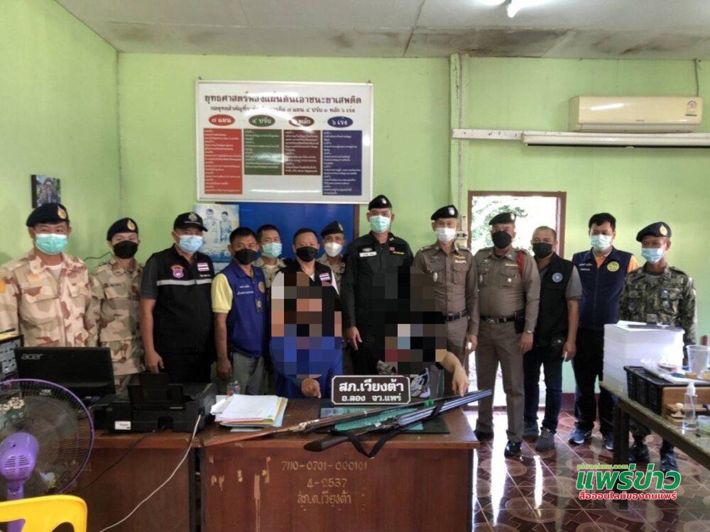 รายที่สองเวลา 06.30 น. เข้าตรวจค้นตามหมายค้นของศาลจังหวัดแพร่ โดยเข้าตรวจค้นบ้านเลขที่ 1/2 หมู่ 3 ต.เวียงต้า อ.ลอง ผลการตรวจค้นพบอาวุธปืนยาวแบบประกอบเอง (ปืนแก๊บ) จำนวน 1 กระบอก พร้อมเครื่องกระสุนปืน 1 ชุด , ยาบ้า จำนวน 1 เม็ด และได้สุ่มตรวจปัสสาวะพบผลเป็นบวก