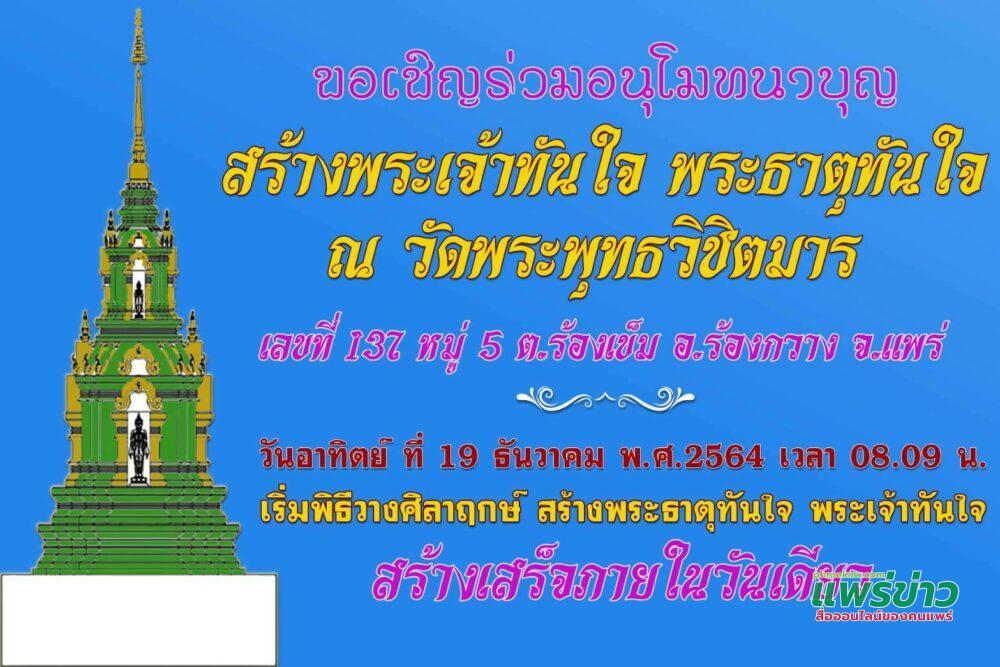 ครูบาพัตรวิสุทธสีโล รักษาการเจ้าอาวาสวัดพระพุทธวิชิตมาร บ้านใหม่จัดสรร หมู่ 5 ต.ร้องเข็ม อ.ร้องกวาง จ.แพร่ เจริญพรว่า ตามที่ วัดพระพุทธวิชิตมาร รับถวายกฐิน ประจำปี 2564 โดยมีเจ้าภาพจากหลายฝ่าย นำโดย รศ.ดร.ธีร เจียศิริพงษ์กุล กรรมการการไฟฟ้าส่วนภูมิภาค นายอรุโณทัย ลิ้มวรพันธ์ ผู้จัดการไฟฟ้าส่วนภูมิภาคจังหวัดแพร่ นายศฤงคาร จันทร์ศรี อดีตผู้จัดการไฟฟ้าส่วนภูมิภาคจังหวัดแพร่ พร้อมด้วย ผู้จัดการไฟฟ้าส่วนภูมิภาค สาขาอำเภอต่างๆในจังหวัดแพร่