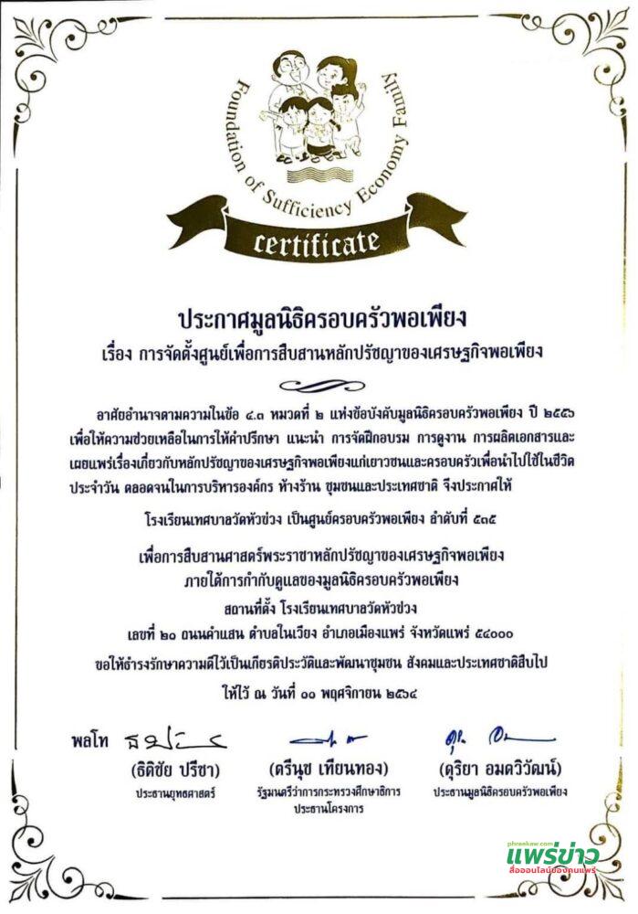 เมื่อวันที่ 11 พฤศจิกายน 2564 เวลา 09.00 น. ศูนย์ครอบครัวพอเพียง โรงเรียนเทศบาลวัดหัวข่วง สังกัดกองการศึกษา เทศบาลเมืองแพร่ ประกอบด้วยนางลัลน์ทริมาล วงศ์บุรี รักษาการผู้อำนวยการสถานศึกษาโรงเรียนเทศบาลวัดหัวข่วง นางอุณรัศม์ อินเครือ นางศิริพรรณ จุลกาฬ และนางสาวอัมพิกา ศรีใจวงศ์ คณะครูผู้รับผิดชอบโครงการ เข้าร่วมพิธีรับมอบสาส์นตราตั้ง ป้ายศูนย์ครอบครัวพอเพียง และเกียรติบัตรผู้ผ่านโครงการอบรมเชิงปฏิบัติการการส่งเสริมศักยภาพครูในจังหวัดแพร่ จากมูลนิธิครอบครัวพอเพียง ณ ศูนย์ครอบครัวพอเพียง โรงเรียนนารีรัตน์จังหวัดแพร่