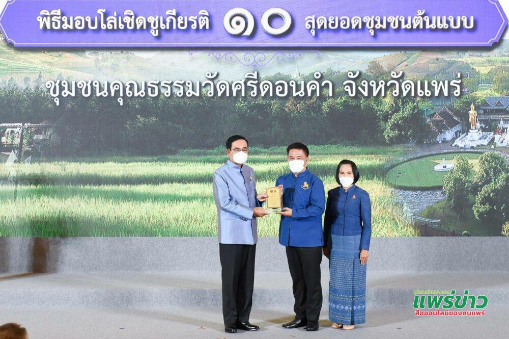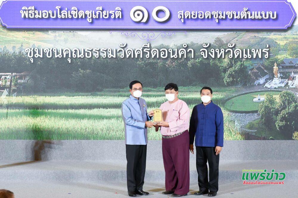 วันนี้ 25 พ.ย.64 นายสมหวัง พ่วงบางโพ ผู้ว่าราชการจ.แพร่ วัฒนธรรม จ.แพร่ นายโกมล พานิชพันธ์ และนายพัตร์ อารินทร์ ตัวแทนชุมชนวัดศรีดอนคำ อ.ลอง จ.แพร่ รับมอบโล่รางวัลเชิดชูเกียรติ 10 สุดยอดชุมชนต้นแบบ “เที่ยวชุมชน ยลวิถี” โดยกระทรวงวัฒนธรรม จาก พลเอกประยุทธ์ จันทร์โอชา นายกรัฐมนตรีและรัฐมนตรีว่าการกระทรวงกลาโหม ณ ตึกสันติไมตรี ทำเนียบรัฐบาล กทม.