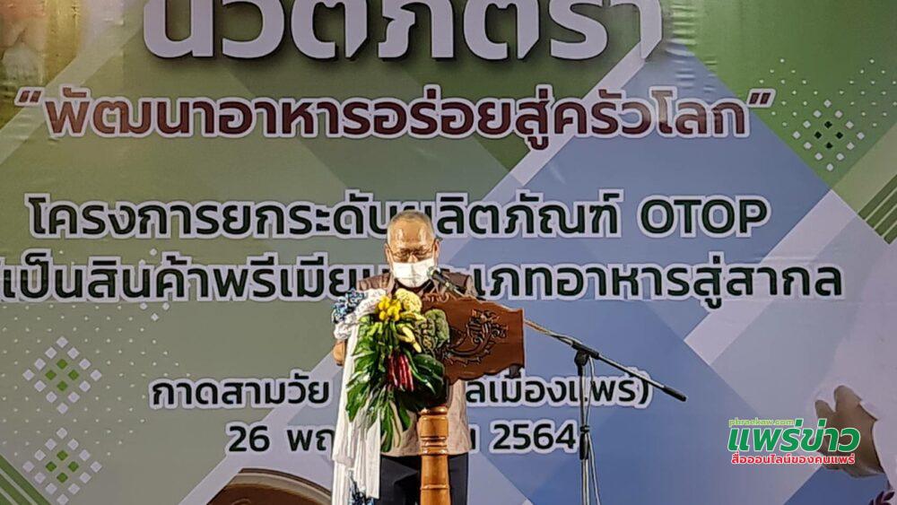 เมื่อเวลา 17.00 น. วันที่ 26 พ.ย.64 ณ เวทีกาดสามวัย หน้าศาลากลางจังหวัดแพร่ อ.เมืองแพร่ จ.แพร่ สนง.พัฒนาชุมชน จ.แพร่ จัดงานแถลงข่าว นวัตภัตรา พัฒนาอาหารอร่อยสู่ครัวโลก “โครงการยกระดับผลิตภัณฑ์ OTOP ให้เป็นสินค้า Premium ประเภทอาหาร สู่สากล โดยมี นายวิเชียร อนุสาสนนันท์ รอง ผวจ.แพร่ เป็นประธานเปิดงาน โดยมีผู้มีเกียรติ อาทิ นายวรวัจน์ เอื้ออภิญญกุล อดีตรัฐมนตรีว่าการกระทรวงวิทยาศาสตร์และเทคโนโลยี นายอนุวัธ วงศ์วรรณ นายกอบจ.แพร่ นายศุภวุฒิ พุฒิตรง รองนายก อบจ.น่าน นายวาทิต ปัญญาคม ปลัดจังหวัดแพร่และหัวหน้าส่วนราชการ รวมถึงสื่อมวลชนทุกแขนง เข้าร่วมพิธีเปิด
