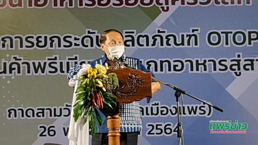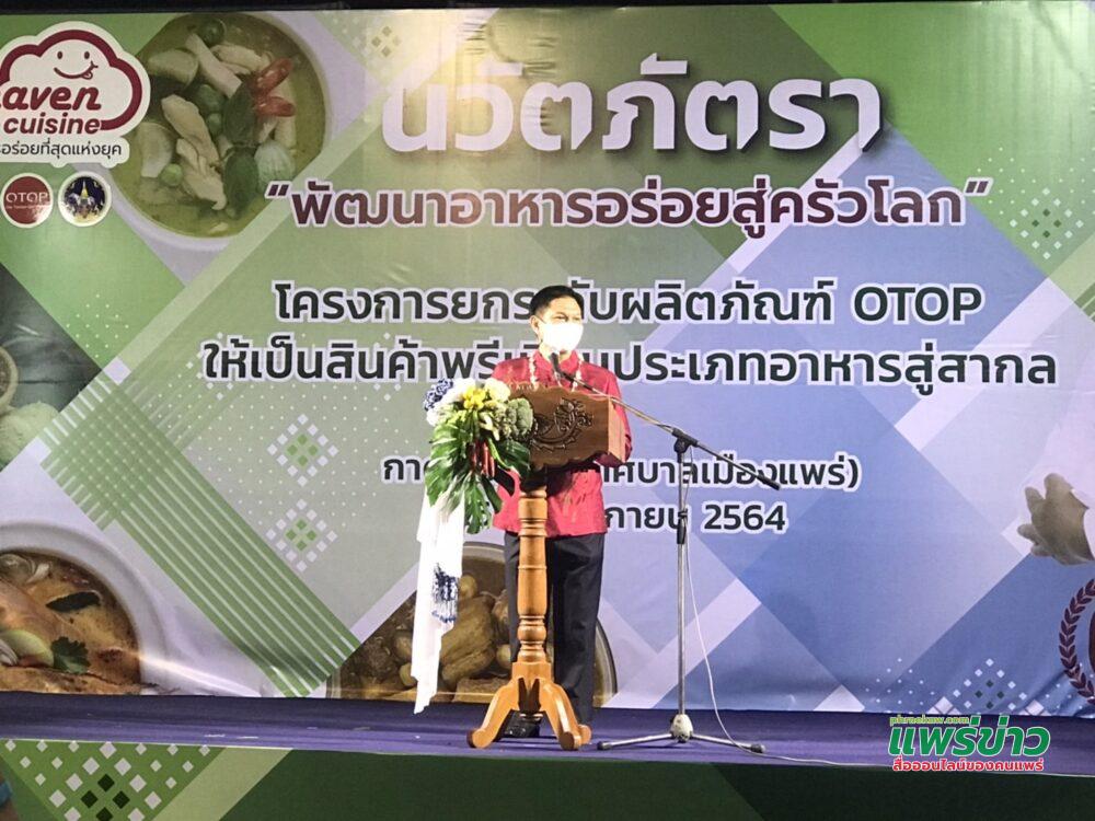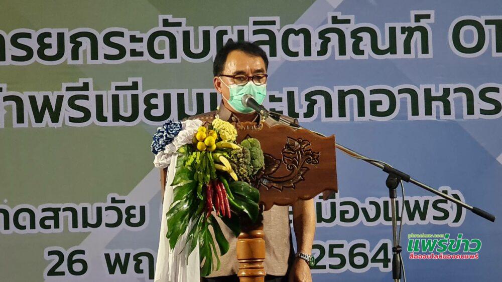 นายวิเชียร อนุสาสนนันท์ รอง ผวจ.แพร่ กล่าวเปิดงาน ว่า รู้สึกยินดีที่กรมการพัฒนาชุมชน ได้สนับสนุนงบประมาณให้จังหวัดแพร่ดำเนินโครงการยกระดับผลิตภัณฑ์ OTOP ให้เป็นสินค้า Premium ประเภทอาหารสู่สากล เพื่อพัฒนาผลิตภัณฑ์อาหารให้มีคุณภาพมาตรฐาน เป็นที่ยอมรับของผู้บริโภค ตลอดจนเป็นการส่งเสริมการประชาสัมพันธ์และเพิ่มช่องทางการตลาดให้ผู้ผลิตผู้ประกอบการ ขณะนี้จังหวัดแพร่ ได้มีมาตรการผ่อนปรนเพื่อกระตุ้นเศรษฐกิจโดยให้หน่วยงานสามารถดำเนินการจัดงานต่างๆได้ภายใต้มาตรการควบคุมการป้องกันการแพร่ระบาดอย่างเคร่งครัด ซึ่งจะเป็นการช่วยส่งเสริมจังหวัด ทำให้ผู้ผลิตกระตุ้นเศรษฐกิจของผู้ประกอบการ พ่อค้าแม่ค้าและประชาชนให้มีรายได้เพิ่มขึ้นและมีความสุขเพิ่มขึ้น