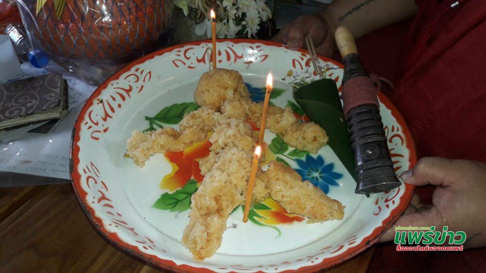 ต่อมาทางพระสงฆ์ที่ทำพิธี จะนำข้าวเหนียวมาปั้นเป็นรูปคนหรือวานร ก่อนสวดและใช้มีดหมดตัวเป็น 3 ส่วนตามความเชื่อ ส่วนที่ 1 ส่วนหัวเอาไปถวายหน้าพระพุทธรูป อีก 2 ส่วนเอาไปลอยน้ำ และเอาไปให้สัตว์บกประเภท เป็ด ไก่ และสุนัข แต่จะไม่เอาไปรับประทานหรือให้ผู้อื่น ต้องสละข้าวนึ่งทั้งไห ซึ่งเป็นความเชื่อที่สืบต่อกันมา แต่เกิดขึ้นไม่บ่อยนัก