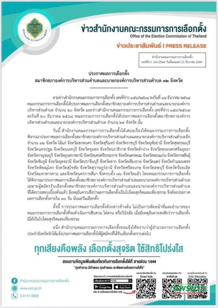 เมื่อวันที่21 ธันวาคม 2564 สำนักงาน กกต.แจ้งว่า กกต.ได้พิจารณาและประกาศผลการเลือกตั้งสมาชิกสภาองค์การบริหารส่วนตำบลและนายกองค์การบริหารส่วนตำบลอีกจำนวน 32 จังหวัด ซึ่งก่อนหน้าได้ประกาศรับรองไป 20จังหวัดและ 24จังหวัดและวันนี้ประกาศรับรองอีก 32 จังหวัดได้แก่