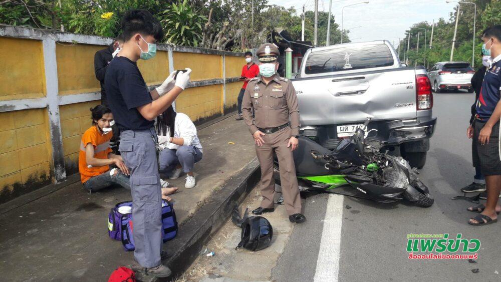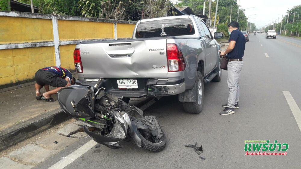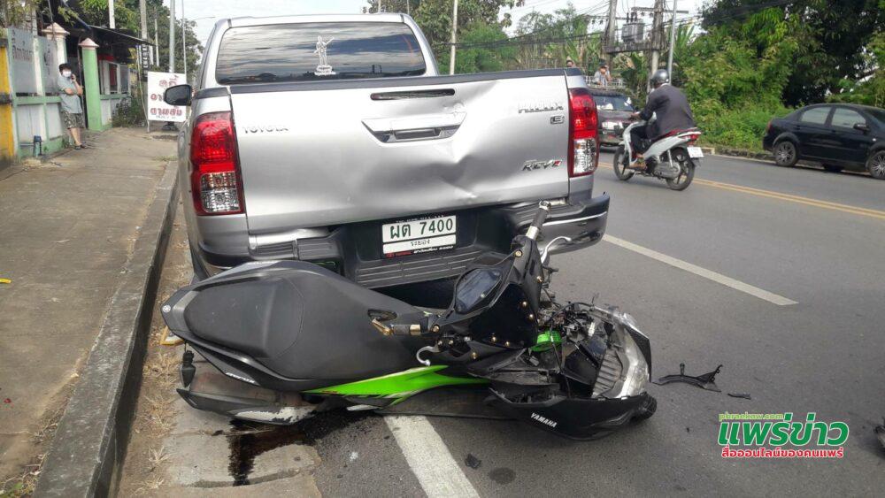 บริเวณที่เกิดเหตุข้างถนนพบรถยนต์กระบะโตโยต้า แค็ป สีบอนซ์ หมายเลขที่เบียน ผต 7400 ระยอง ที่จอดข้างถนนถูกรถจักรยานยนต์ยามาฮ่า สีเขียวหมายเลขทะเบียน 1 กฉ 8819 แพร่ พุ่งชนท้าย จนรถจักรยานยนต์ล้มคว่ำคาท้ายรถยนต์กระบะ จนรถพังเสียหาย คนขับเป็นชายวัยรุ่น ทราบชื่อ นายจิรโชติ ทองศรี อายุ 21 ปี บ้านเลขที่ 46/2 บ.ต้นไคร้ ม.5 ต.ช่อแฮ อ.เมือง จ.แพร่ ได้รับบาดเจ็บ พลเมืองดี และหน่วยกู้ภัยแพร่ช่วยปฐมพยาบาลเบื้องต้น