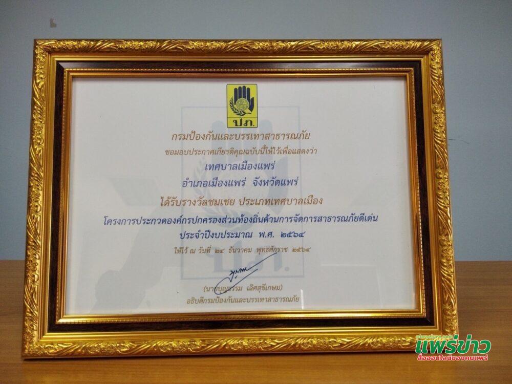 ผู้สื่อข่าวรายงานว่าเมื่อวันที่ 29 ธันวาคม 2564 ได้รับการเปิดเผยจาก นายโชคชัย พนมขวัญ นายกเทศมนตรีเมืองแพร่ว่าตามที่กรมป้องกันและบรรเทาสาธารณภัยได้จัดประกวดองค์กรปกครองส่วนท้องถิ่น ด้านการจัดการสาธารณภัยดีเด่น ประจำปี 2564