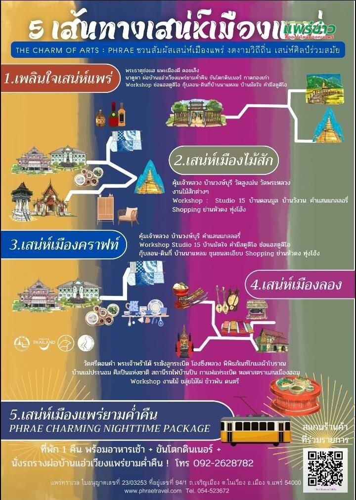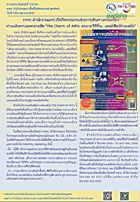 นายอนันต์ สีแดง ผู้อำนวยการ ททท. สำนักงานแพร่ กล่าวว่า ในปีนี้ ททท. สำนักงานแพร่ ร่วมกับ เครือข่ายด้านการท่องเที่ยวในพื้นที่จังหวัดแพร่ และ Trip Nice Day จึงนำเสน่ห์ของเมืองแพร่ มาจัดทำเป็นเส้นทางท่องเที่ยว “5 เส้นทางเสน่ห์เมืองแพร่”: ผ่านกิจกรรม The Charm of ARTsงดงามวิถีถิ่น..เสน่ห์ศิลป์ร่วมสมัย” เป็นการส่งเสริมการท่องเที่ยวจังหวัดแพร่ซึ่งสามารถเที่ยวได้ทั้งปีและแพร่ยังเป็นประตูสู่ภาคเหนืออีกด้วย