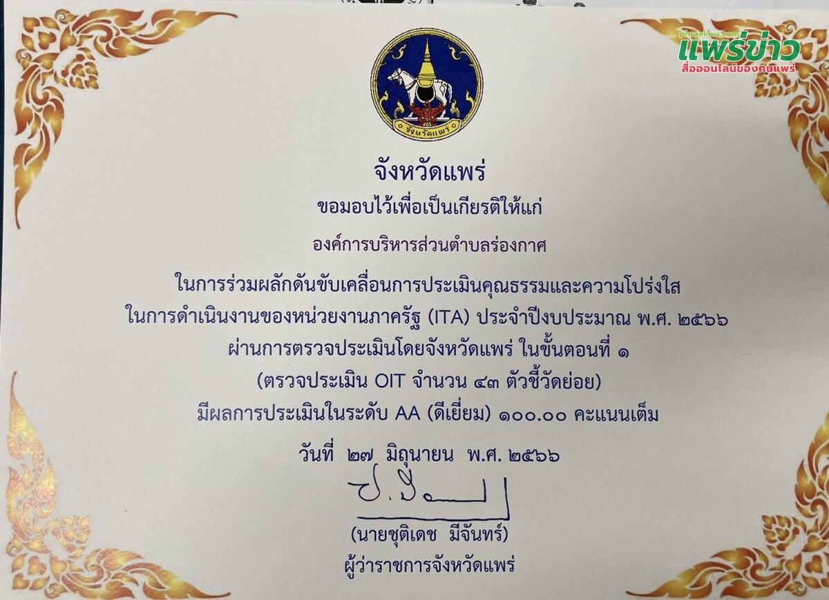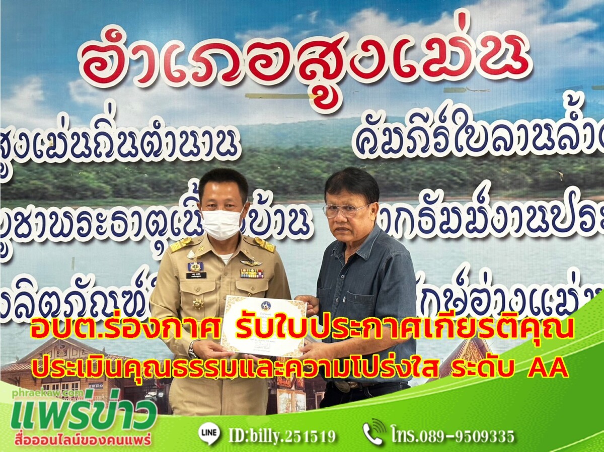 วันที่ 3 กรกฎาคม 2566 เวลา 08.30 น. องค์การบริหารส่วนตำบลร่องกาศ โดย นายสมคิด ยอดสาร นายกองค์การบริหารส่วนตำบลร่องกาศ มอบหมายให้ อ.มานิตย์ นันทวิเชียร รองนายกองค์การบริหารส่วนตำบลร่องกาศ เป็นตัวแทนเข้ารับมอบใบประกาศเกียรติคุณให้กับองค์กรปกครองส่วนท้องถิ่น ในการร่วมผลักดันขับเคลื่อนการประเมินคุณธรรมและความโปร่งใส ในการดำเนินงานของหน่วยงานภาครัฐ (ITA) ประจำปีงบประมาณ พ.ศ. 2566 ผ่านการตรวจประเมินโดยจังหวัดแพร่ ในขั้นตอนที่ 1ที่มีผลการประเมินในระดับ AA (ดีเยี่ยม) 100.00 คะแนน จึงขอขอบคุณ ผู้เกี่ยวข้อง ทุกส่วนงาน ที่ให้ความร่วมมือในการร่วมผลักดันขับเคลื่อนการประเมินคุณธรรมและความโปร่งใสฯล ประจำปี ด้วยดี