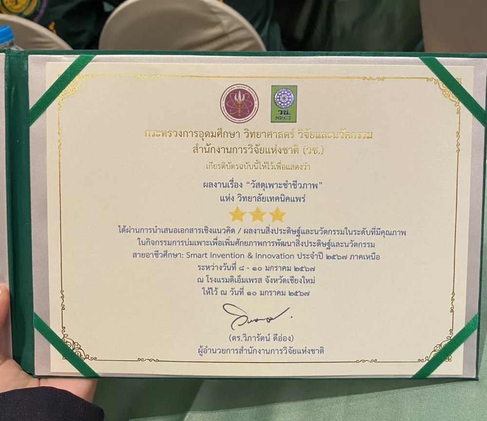 “ได้รับรางวัล 3 ดาว ” จากผลงานเรื่อง “วัสดุเพาะชำชีวภาพ” ได้ผ่านการนำเสนอเอกสารเชิงแนวคิด/ ผลงานสิ่งประดิษฐ์และนวัตกรรมระดับมีคุณภาพ รับเงินรางวัล 3,000 บาท