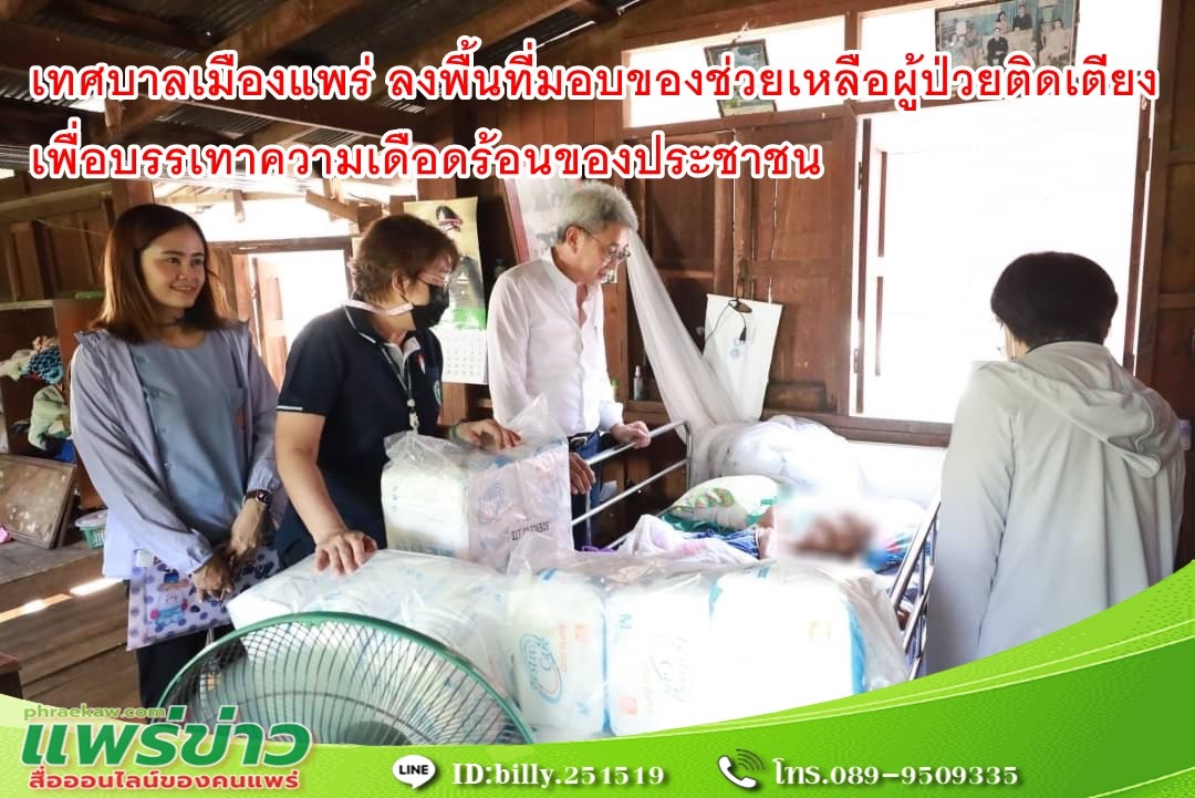 วันพุธที่ 13 มีนาคม 2567 เวลา 10.00 น. นายโชคชัย พนมขวัญ นายกเทศมนตรีเมืองแพร่ พร้อมด้วยนางสาวนิตยา พงศ์พุฒิ พยาบาลวิชาชีพปฏิบัติการ เจ้าหน้าที่กองสาธารณสุขและสิ่งแวดล้อม นางดวงพร ภาคาหาญ ผู้อำนวยการศูนย์สุขภาพชุมชนเขตเมือง โรงพยาบาลแพร่ (ร่องซ้อ) นางอภัณตรี วรรณสมพร พยาบาลวิชาชีพชำนาญการ และนางบุญญลักษณ์ ลิ้มวิเศษศิลป์ พยาบาลวิชาชีพชำนาญการ ศูนย์สุขภาพชุมชนเขตเมืองโรงพยาบาลแพร่ (ร่องซ้อ) ร่วมลงพื้นที่มอบของช่วยเหลือผู้ป่วยติดเตียง ตามโครงการสนับสนุนผ้าอ้อมผู้ใหญ่ แผ่นรองซับ และแผ่นเสริมซึมซับ ประจำปีงบประมาณ พ.ศ. 2567