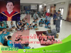พัฒนพงษ์ฯนายกสมาคมอาสาสมัครกู้ภัยจังหวัดแพร่.มอบหมายให้จนท.กู้ภัยแพร่เป็นวิทยากรอบรมป้องกันภัยให้เด็กรร.อบต.ร่องกาศ