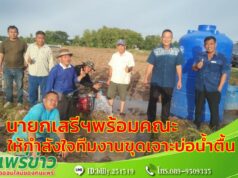 นายกเสรีฯพร้อมคณะให้กำลังใจทีมงานขุดเจาะบ่อน้ำตื้น งานป้องกันฯ ในการขุดเจาะบ่อบาดาลน้ำตื้น เพื่อช่วยเหลือเกษตรกร