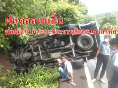 (มีคลิป)ฝนตกถนนลื่นพ่อเฒ่าขับกระบะชนเขาพลิกตะแคงสาหัส