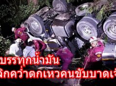 (มีคลิป)ฝนตกถนนลื่นรถบรรทุกน้ำมันพลิกคว่ำตกเหวคนขับบาดเจ็บ