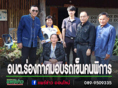 นายกสมคิดพร้อมด้วยคณะผู้บริหาร,ส.อบต.ลงพื้นที่ส่งมอบรถเข็นนั่งช่วยเหลือคนพิการ