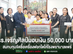 โรงเรียนเจริญศิลป์ มอบเงินบริจาค 50,000 บาท สมทบทุนจัดซื้อเครื่องฟอกไตให้โรงพยาบาลแพร่