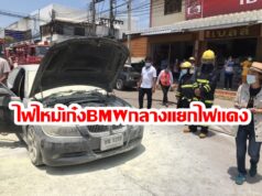 (มีคลิป) ระทึกไฟไหม้เก๋ง BMW กลางสี่แยก เดชะบุญจอดติดไฟแดงคนข้างทางเห็นจึงตระโกนบอกคนขับหนีออกมาทัน