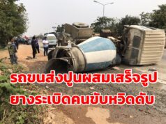 (มีคลิป)รถส่งปูนผสมเสร็จยางระเบิดพลิกลงข้างทางคนขับหวิดดับ